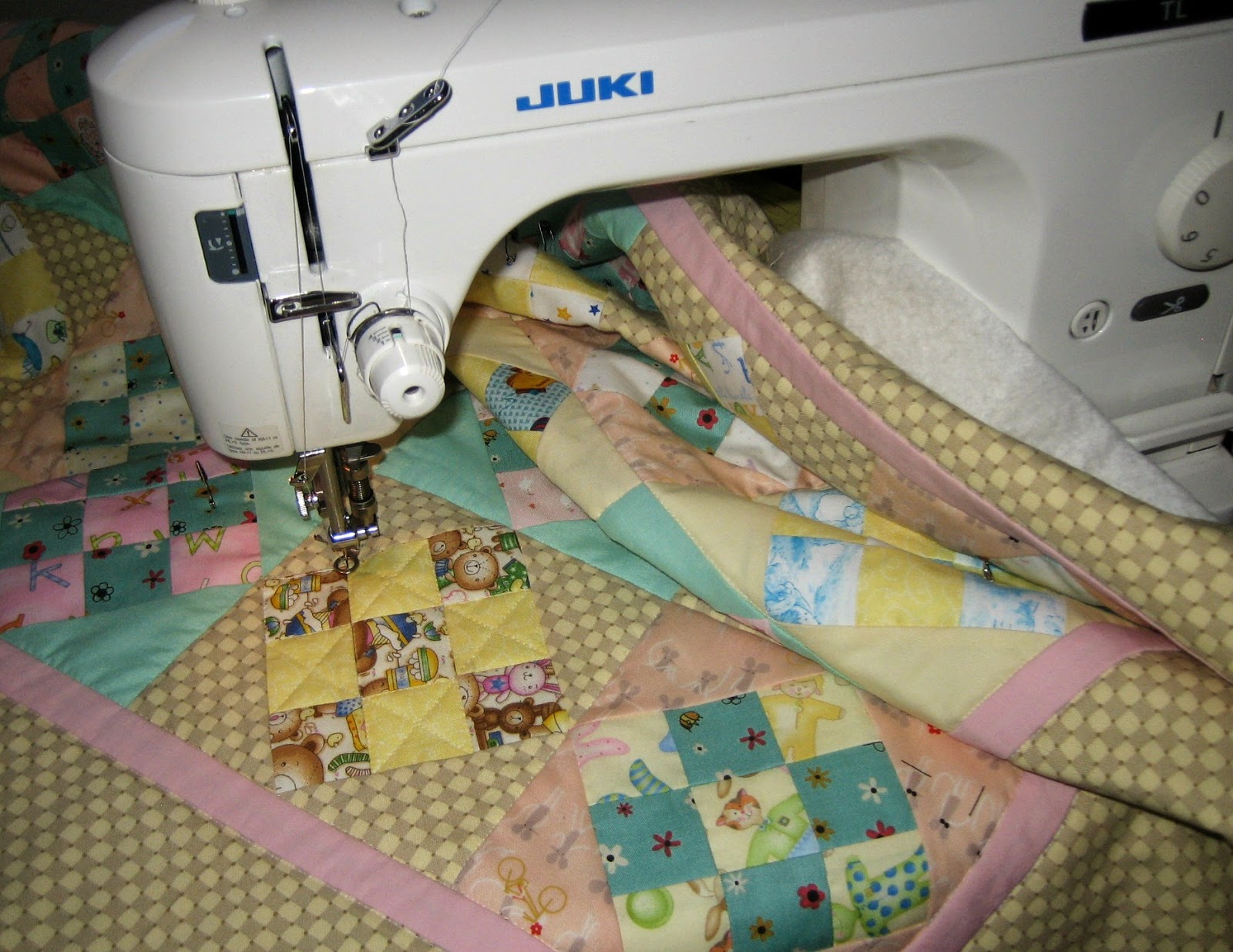 I purposely designed the yellow stars to fall short a bit so they would not actually connect. Then, I was inspired by an Angela Walters book that I happened to have checked out at the time (umm, renewed three times!) to do the bubbles connecting them. The perfect backing was also found in my stash. It is a poly/cotton blend, and therefore it is yet another fabric that I liked well enough to have kept all these years, even though it seemed unlikely to ever be used.