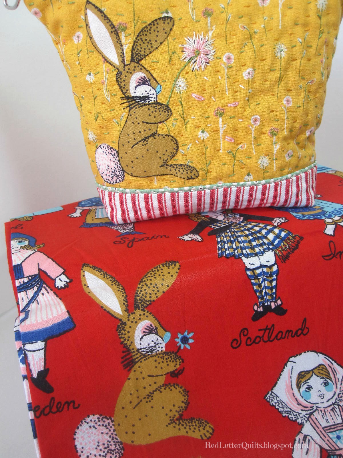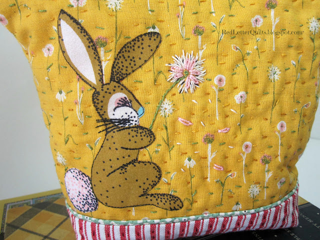 This rabbit is appliqued on some Heather Ross stash, then top-stitched by machine, with black thread.
