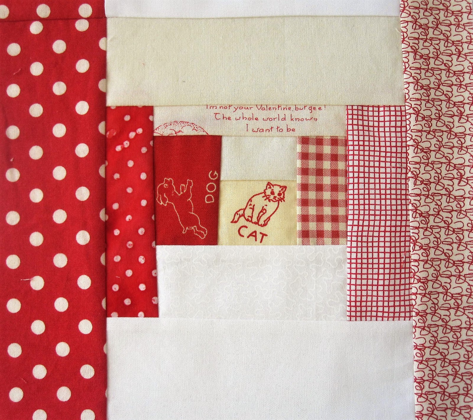 I did not stray from directions this time, well, other than making mine scrappy! I made eight stripsets 14" long, then sub-cut what was needed for each row. I also trimmed allowances to 1/8" so that I could press toward the red.