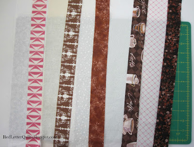 Select FIVE print fabrics. Trim each of these to 1.5" wide x 19".