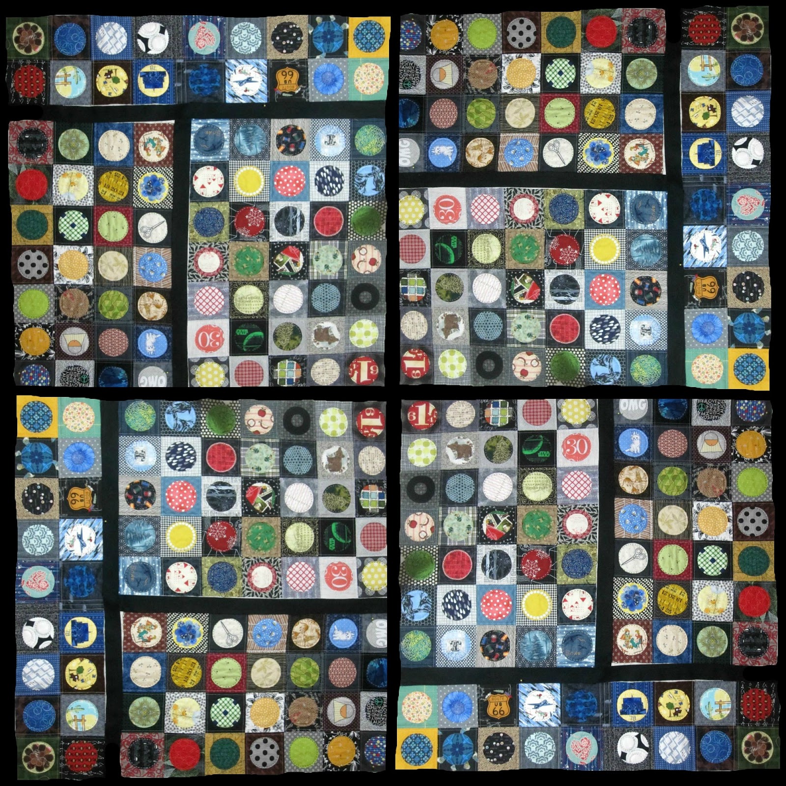 This is the first time I have used the Quilt As You Go method to make a large quilt, and I love that it allows me to work on different stages at the same time. On the sofa, or on the go, I have the hand-quilting to do, while dots continue to multiply on my design wall. I am just a week or so behind with new dots, but have continued to prepare outer rings so catching up will be easy.