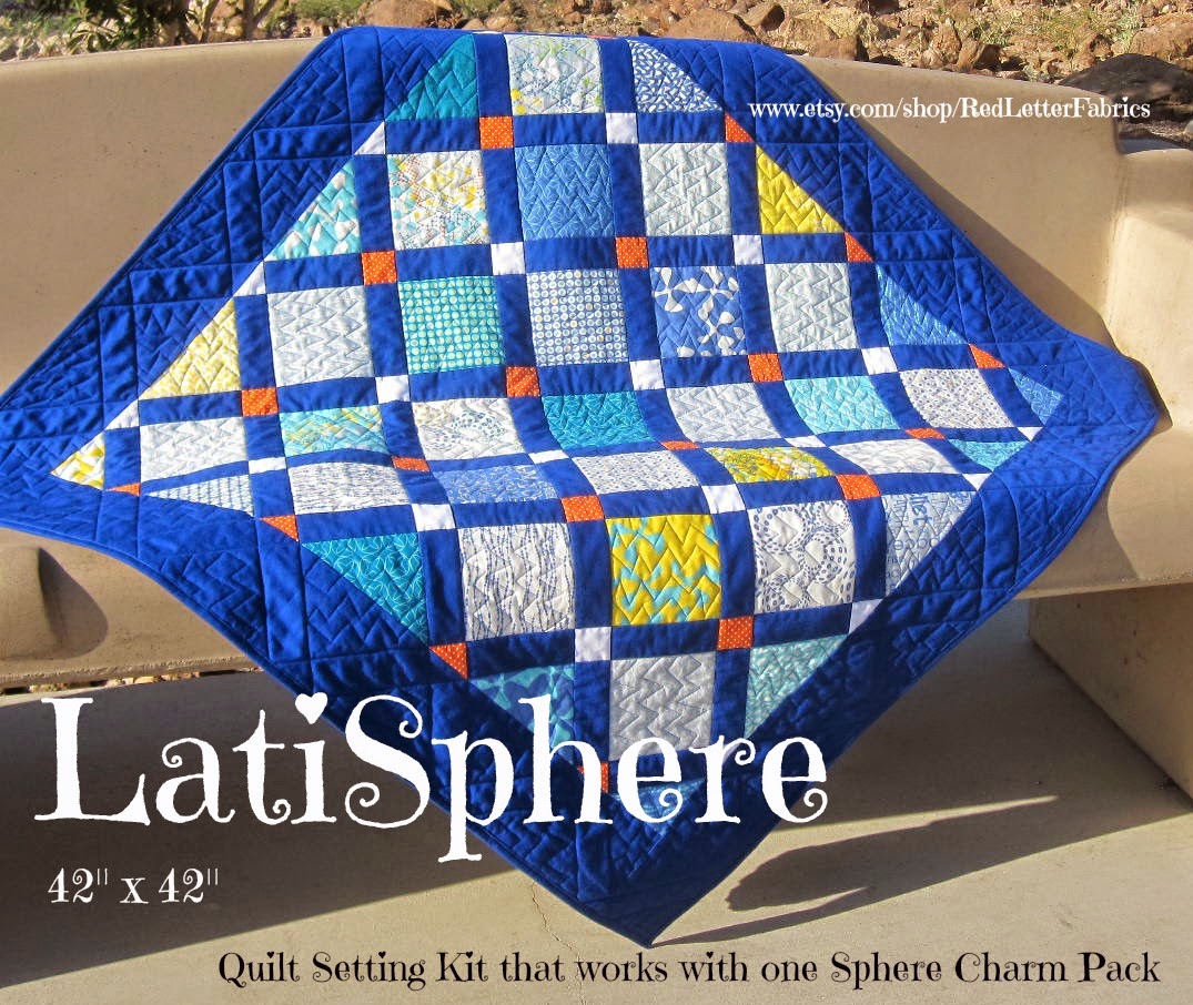 Really no mystery to it though, if you are looking for a fast pattern for a charm pack, this requires 41 x 5" Charm Squares, 64 sashing rectangles 2" x 5", and 40 cornerstone 2" squares (20 each of two colors). Set it all up in rows, stitch it all up, and you have a quick and easy baby quilt top made with just one Charm Pack! I used Sphere by Zen Chic, but this color scheme works well with a lot of current charm packs as well.