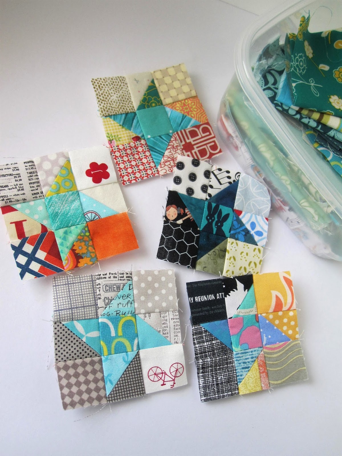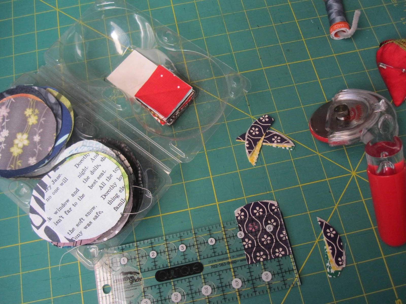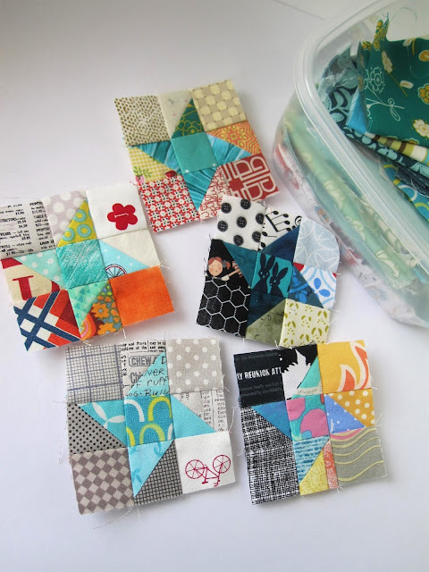 More recently, blocks are emerging from my small HST's, sewn as leader's and ender's from the corners that were clipped after each circle sewn..