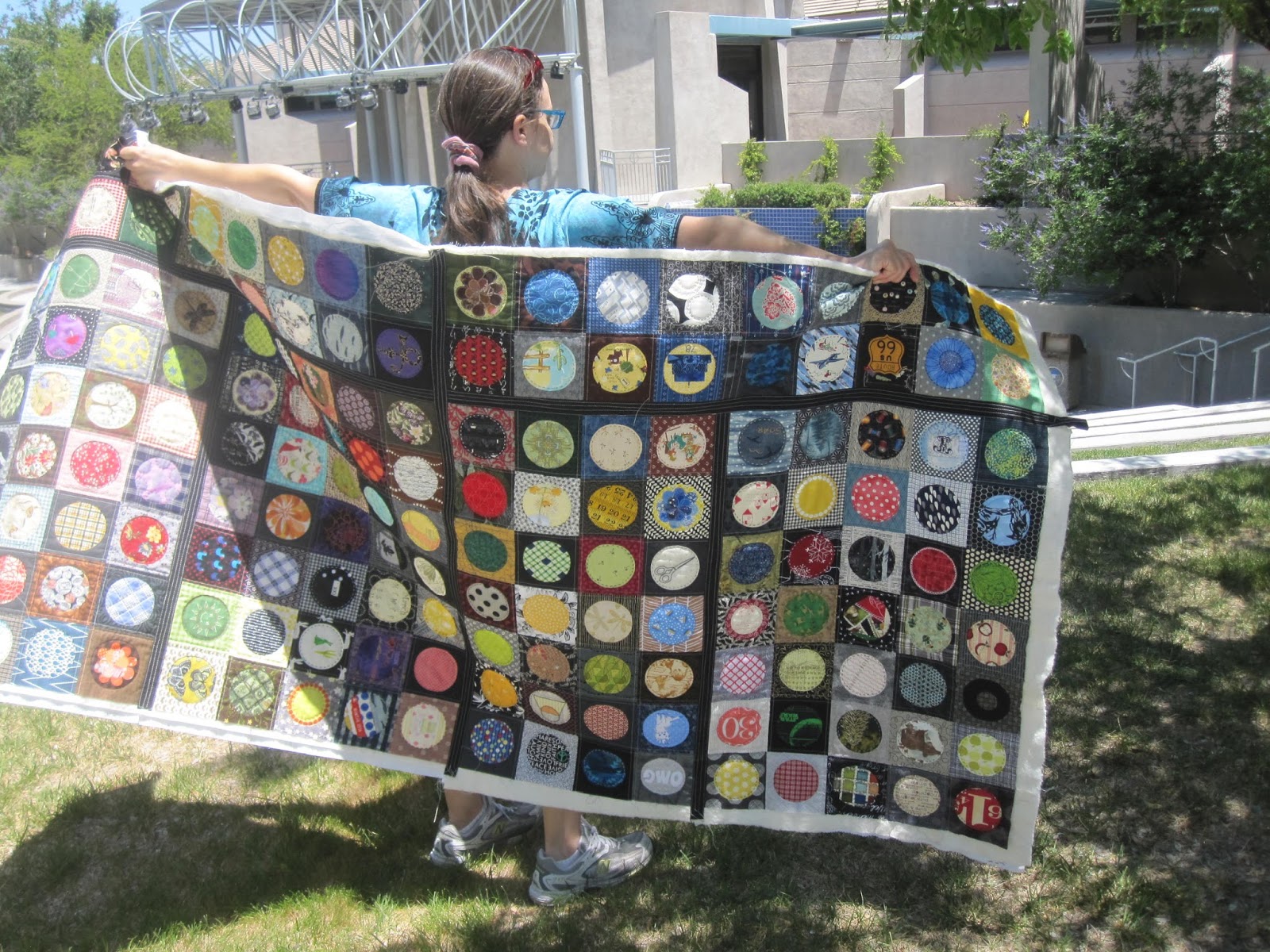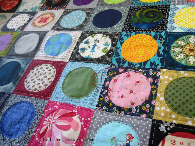 I found I could keep up well if I kept 20 rings (prepared) ahead, then each day I was able to select fabric for the centers. About once per week, I could sit at my machine and finish the circles in a jiffy.