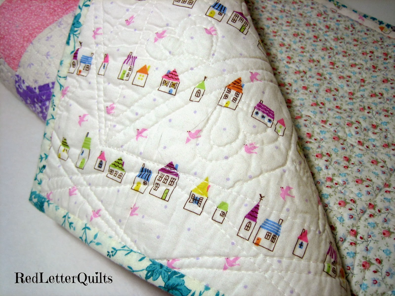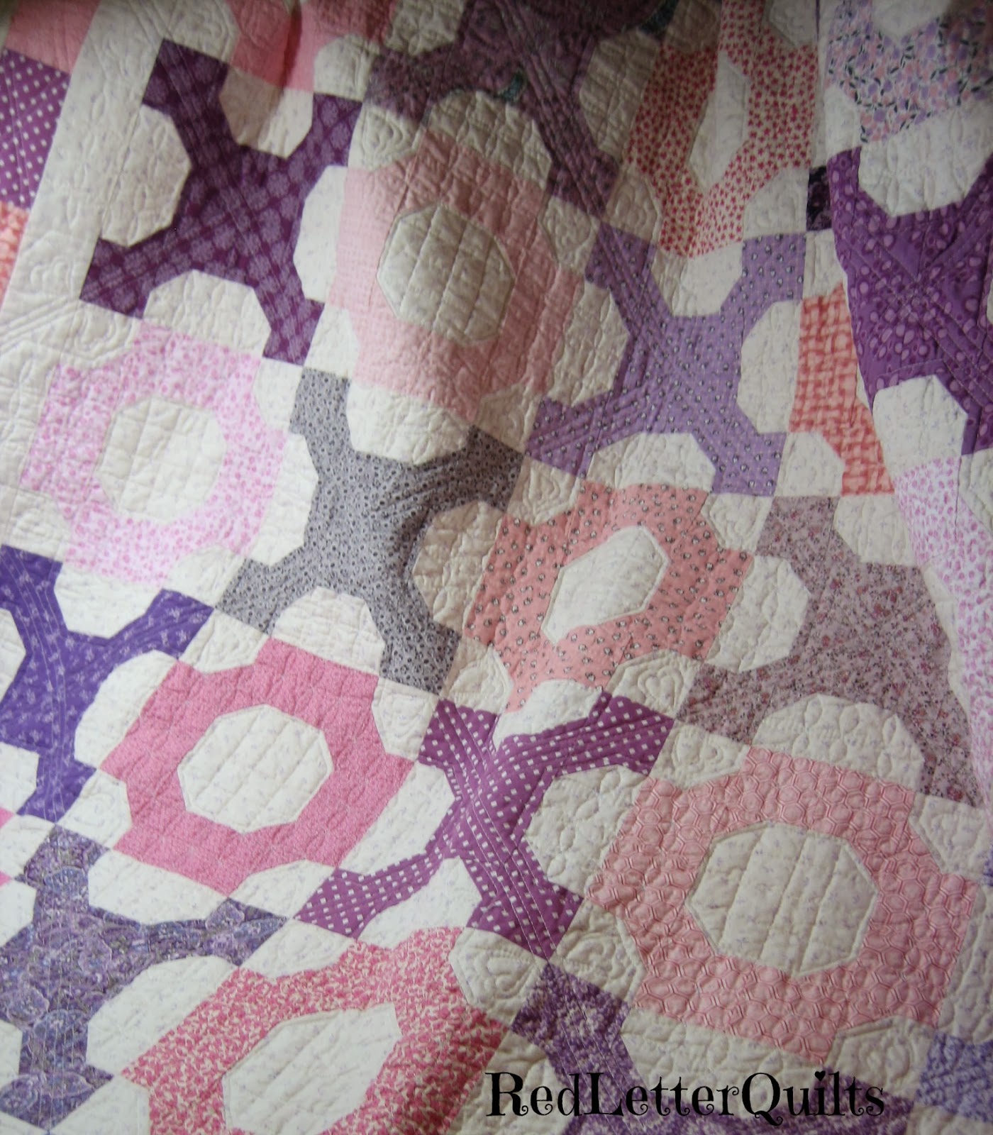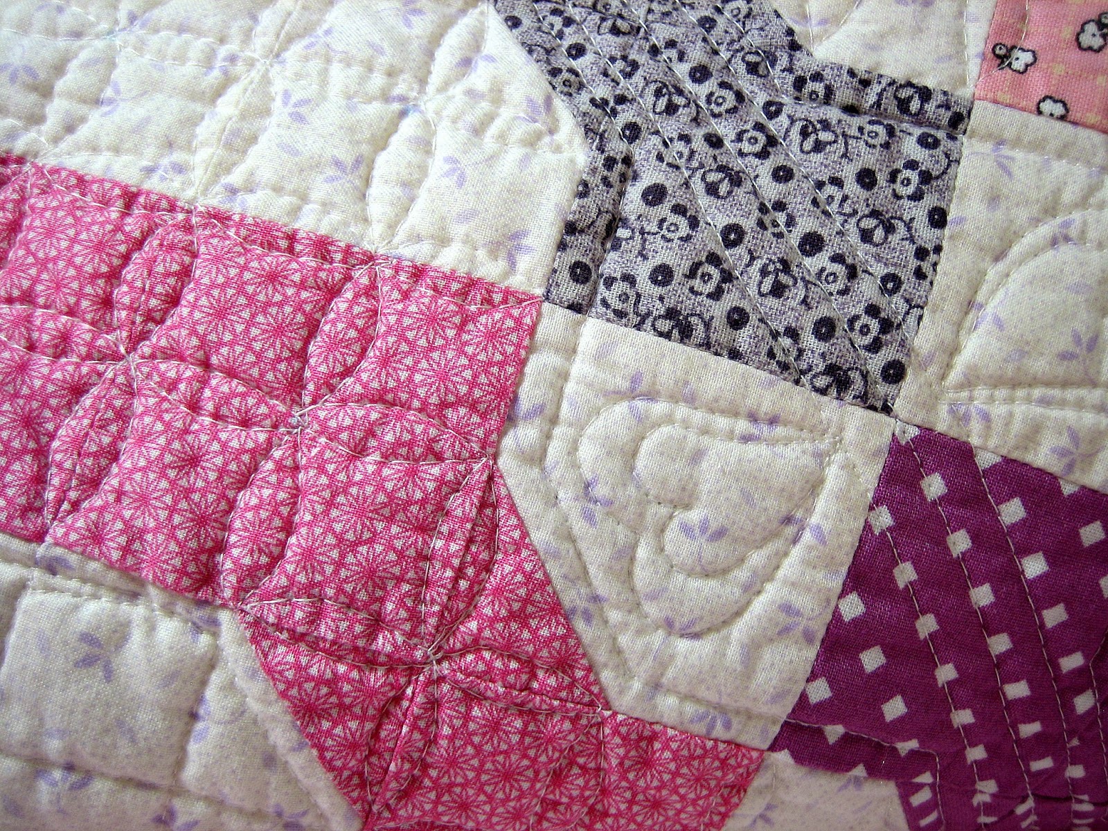 I used no marking, and just very little scoring and free-motion quilted this on Mr. Juki with no walking foot. After some debate, I ended up doodling hearts at the intersections of the purple connectors and a simple grid for the round centers.